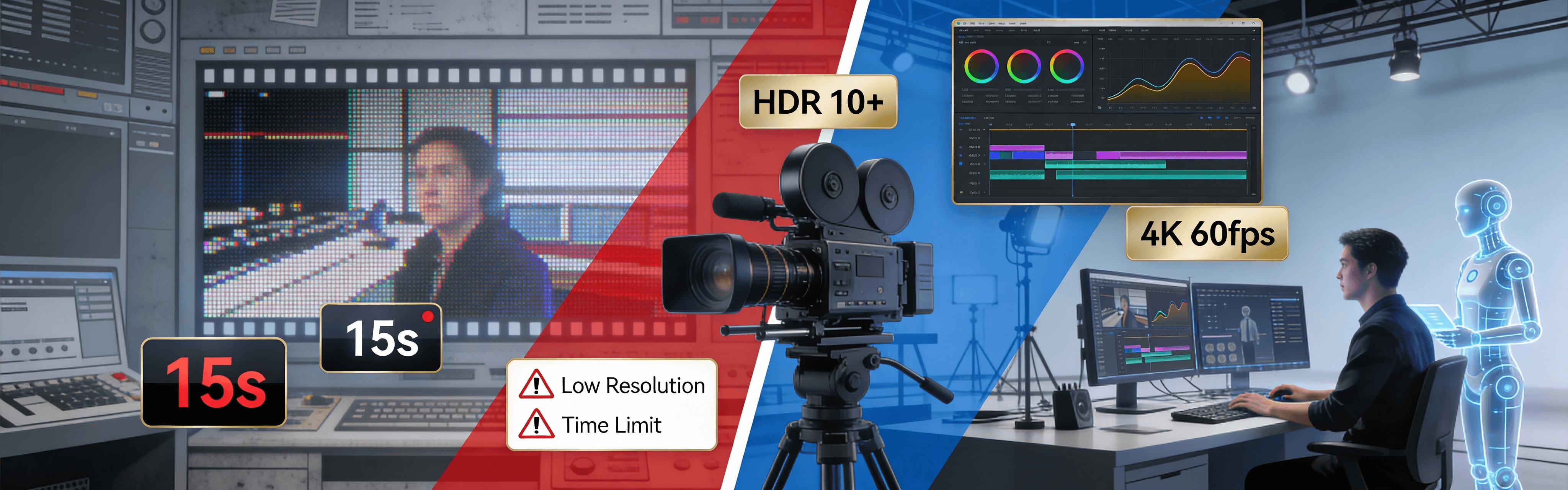 For film professionals, this was perhaps the most damning limitation. Modern cinema and high-end commercial work demand HDR (High Dynamic Range) with 10-bit or higher color depth. An 8-bit limitation meant AI-generated footage would stick out like a sore thumb in any professional project, with visible banding and limited color grading flexibility. More critically, it made compositing AI-generated elements with footage from professional cinema cameras like ARRI Alexa, RED, or Blackmagic completely impractical.